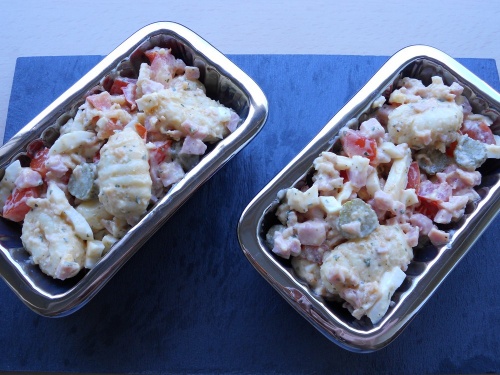 21 jours après conditionnement. Salade piémontaise pommes de terre tomates cornichons avec des morceaux de thon et sauce moutardée quantity. 11 00 kilogramme.