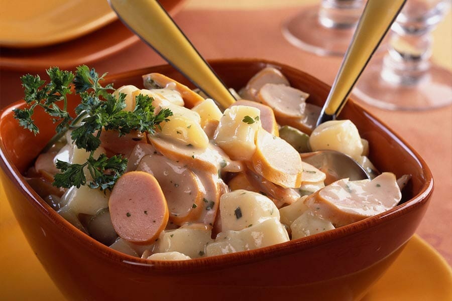 Salade froide composée de pommes de terre crevettes tomates cerises et oignons. Assaisonnée d une sauce vinaigrette au citron et huile d olive sans mayonnaise. Vous serez aussi conquis par nos délices à base de viande pour ne citer que la salade de cervelas et le taboulé au poulet.
